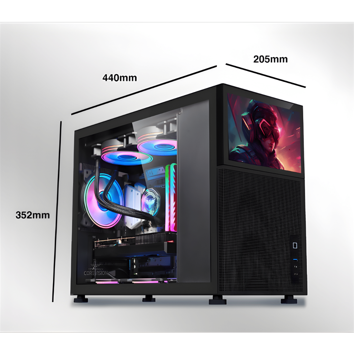 Equipada con una pantalla LCD WXGA de 8 pulgadas (1280 x 800), permite ajustar el ángulo para evitar obstrucciones de la GPU. Además, cuenta con 1 bahía para SSD de 2,5” y 1 bahía para HDD de 3,5”, así como 4 ranuras de expansión para componentes adicionales. Compatible con placas base Mini-ITX de hasta 170 x 170 mm, es el equilibrio perfecto entre estilo y funcionalidad.