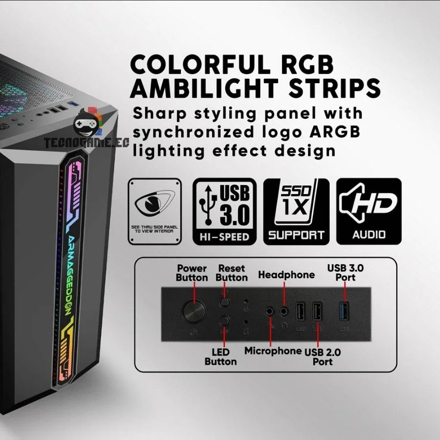 El Armaggeddon Tritron Pro 300 es un case gamer Mid Tower diseñado para ofrecer estética, funcionalidad y compatibilidad en un solo chasis. Fabricado en acero SPCC de 0.45mm, está disponible en color negro o blanco, brindando una estructura sólida y visualmente atractiva.