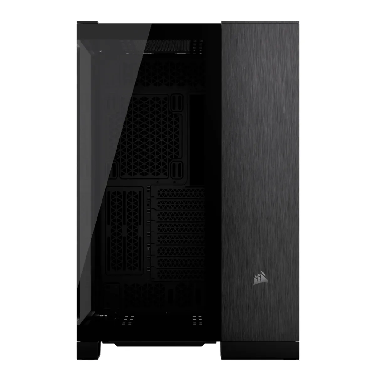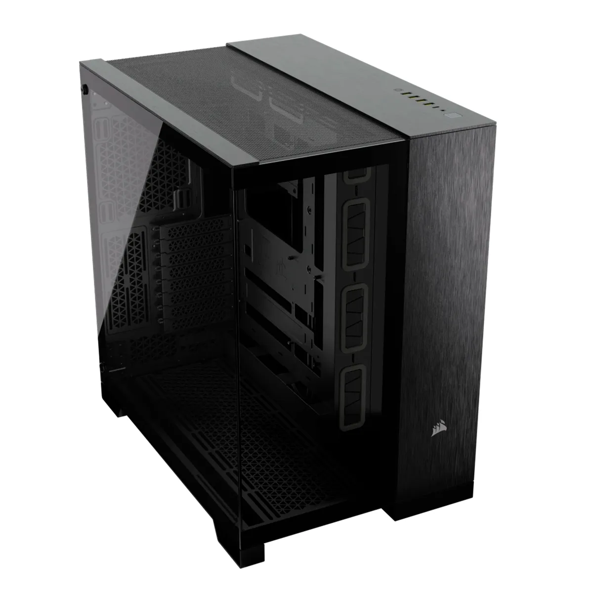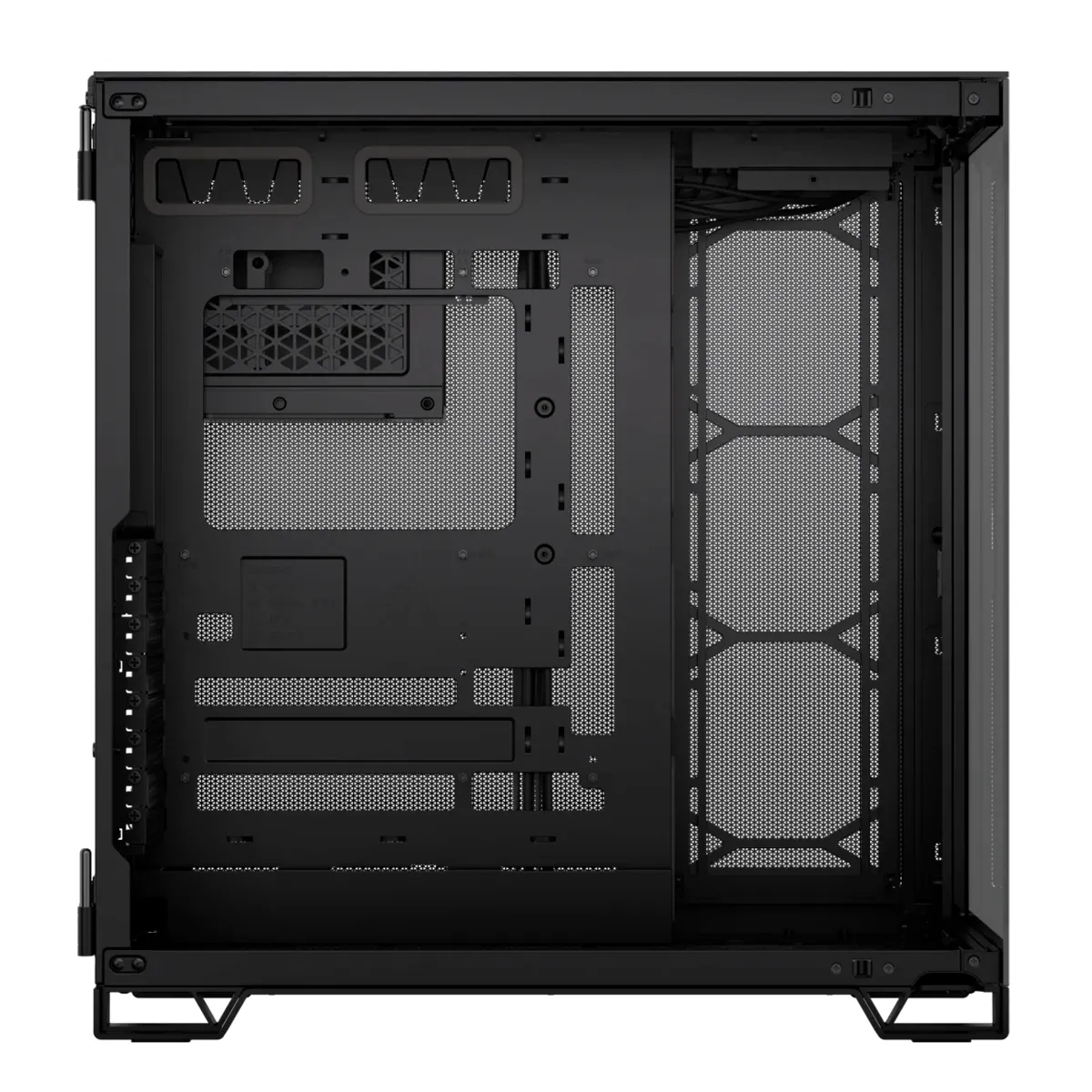 Muestre su diseño más limpio y organizado en una cámara equipada con varios soportes para ventiladores y radiadores, mientras oculta la guía para cables, las unidades de almacenamiento y su fuente de alimentación en la segunda cámara.