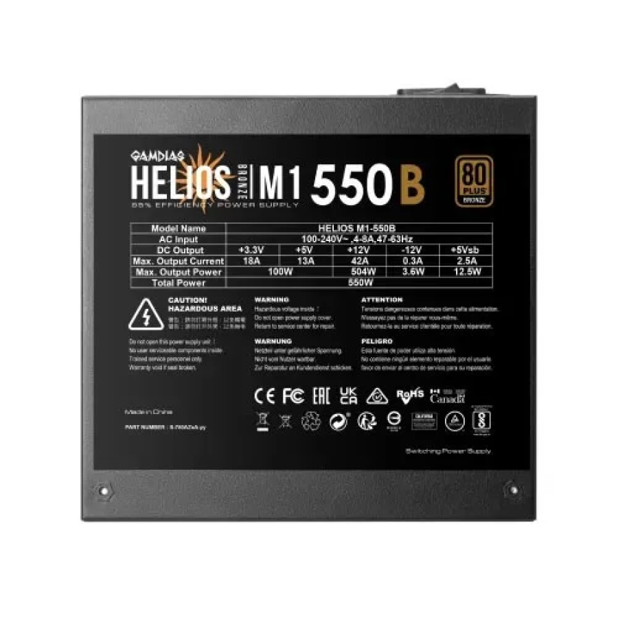 El HELIOS M1-550B cuenta con una certificación 80 PLUS Bronze que garantiza una eficiencia del 85%, y cables negros planos para facilitar la instalación y la gestión del cableado. También está equipado con un ventilador que puede ajustar automáticamente la velocidad del ventilador en función de la temperatura y garantizar un funcionamiento silencioso.