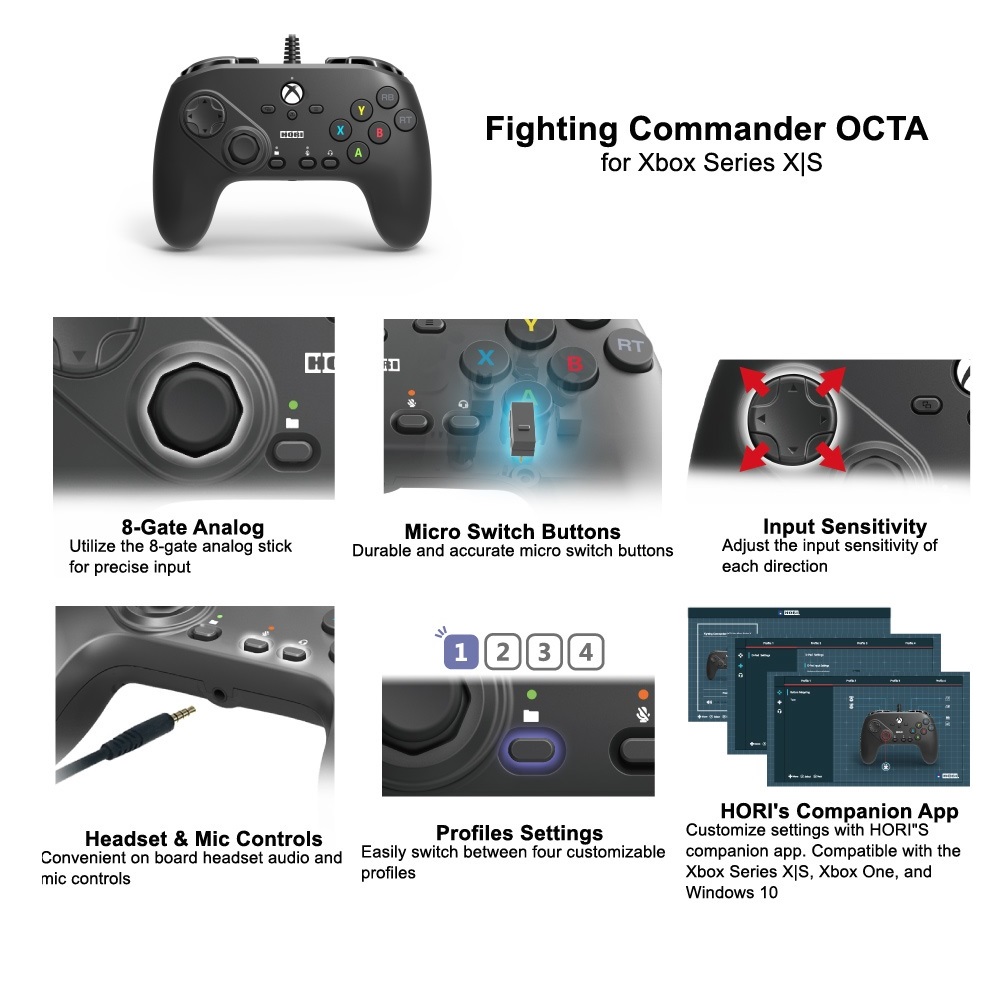 Fighting Commander OCTA diseñado para Xbox Series X|S es un controlador con cable optimizado para juegos de lucha. Cuenta con un diseño de seis botones, botones de microinterruptor duraderos y un joystick analógico de corto alcance con puerta de 8 direcciones para mayor precisión y velocidad de ejecución. También viene equipado con una sensibilidad de entrada ajustable del D-Pad. Lleve sus habilidades al siguiente nivel y cree cuatro perfiles personalizados a través de nuestra aplicación complementaria y cambie entre perfiles con el botón Perfil. Los prácticos controles de audio y micrófono integrados permiten que todos se concentren en el juego. Con licencia oficial de Microsoft. Características: Controlador Wired Pro optimizado para juegos de lucha Presenta un diseño de seis botones, botones de microinterruptor y D-Pad ajustable Personalice y guarde hasta cuatro perfiles con la aplicación complementaria y cambie fácilmente entre ellos con el botón Perfil Stick analógico de corto alcance con puerta de 8 direcciones para mayor precisión y velocidad de ejecución Entrada de auriculares y controles de audio integrados Compatible con Xbox Series X|S, Xbox One y Windows 10 Con licencia oficial de Microsoft